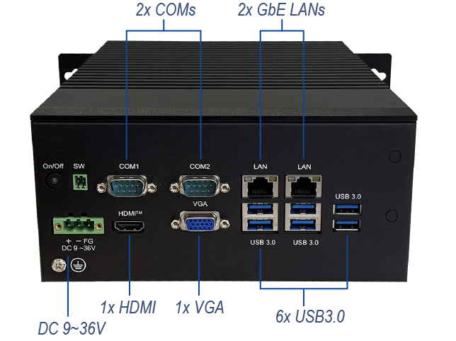 AVS-570系列在一般产品的基础上,加高了散热片高度至51mm,增加了散热片面积,更好的提升了散热效率、优化热流分布、增强结构稳定性、降低噪音以及可以适应各种复杂环境。内存方面,则支持高达32GB DDR4内存,流畅运行不卡顿,支持miniPCIe插槽,可用于WiFi/4G/GPS扩展,自带2个千兆网口,同时还可以再扩展4个千兆网口,提高安全性和可靠性,还支持复杂的网络拓扑。支持扩展光源控制模块:4 x Triggerin/8 x Trigger out/8 x Dl/16 x D0/8路光源控制,满足更高的需求。DC 9~36V的宽压输入提高了设备可靠性,更适用于电压不稳定地区。